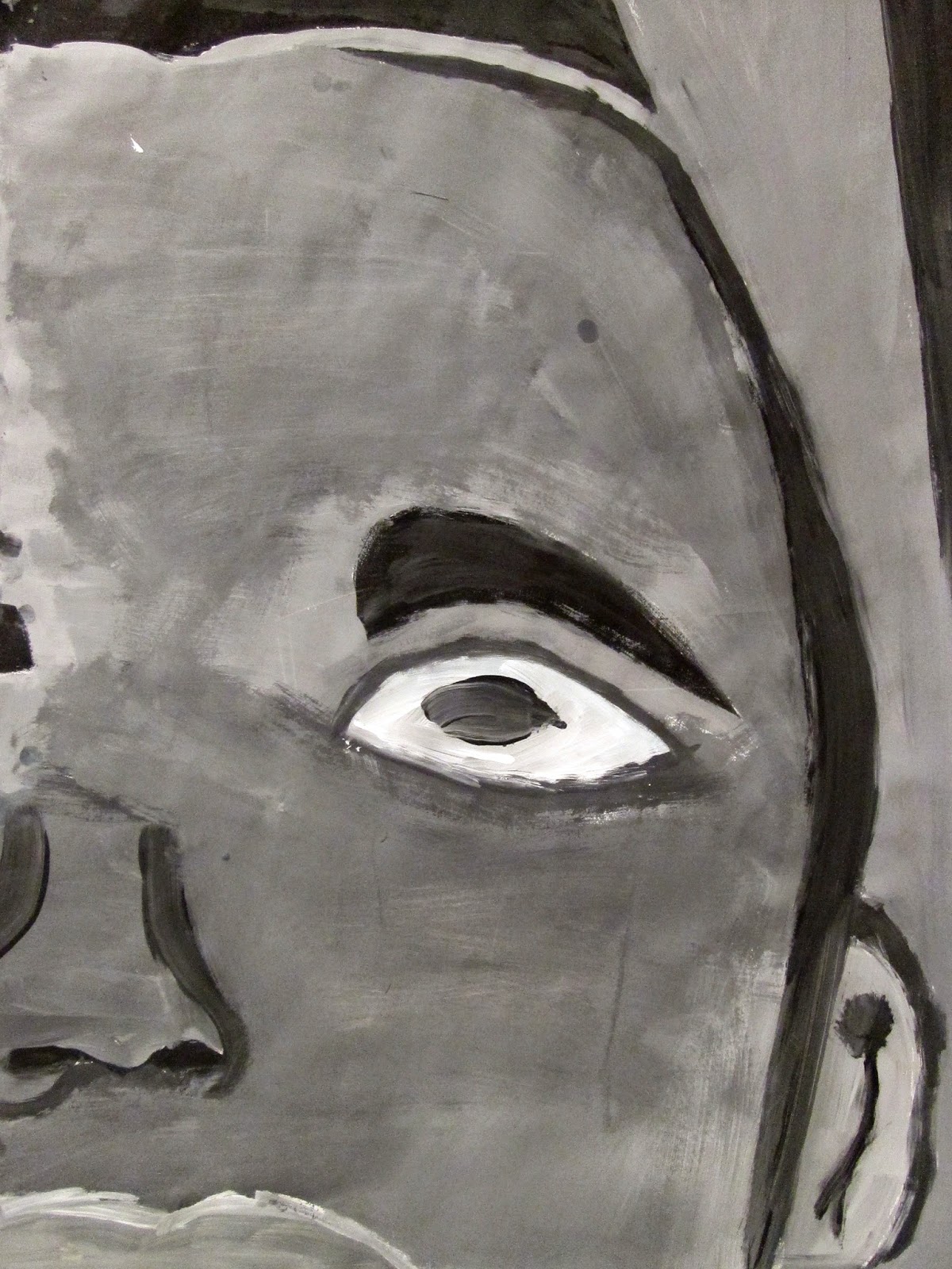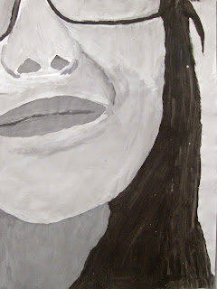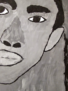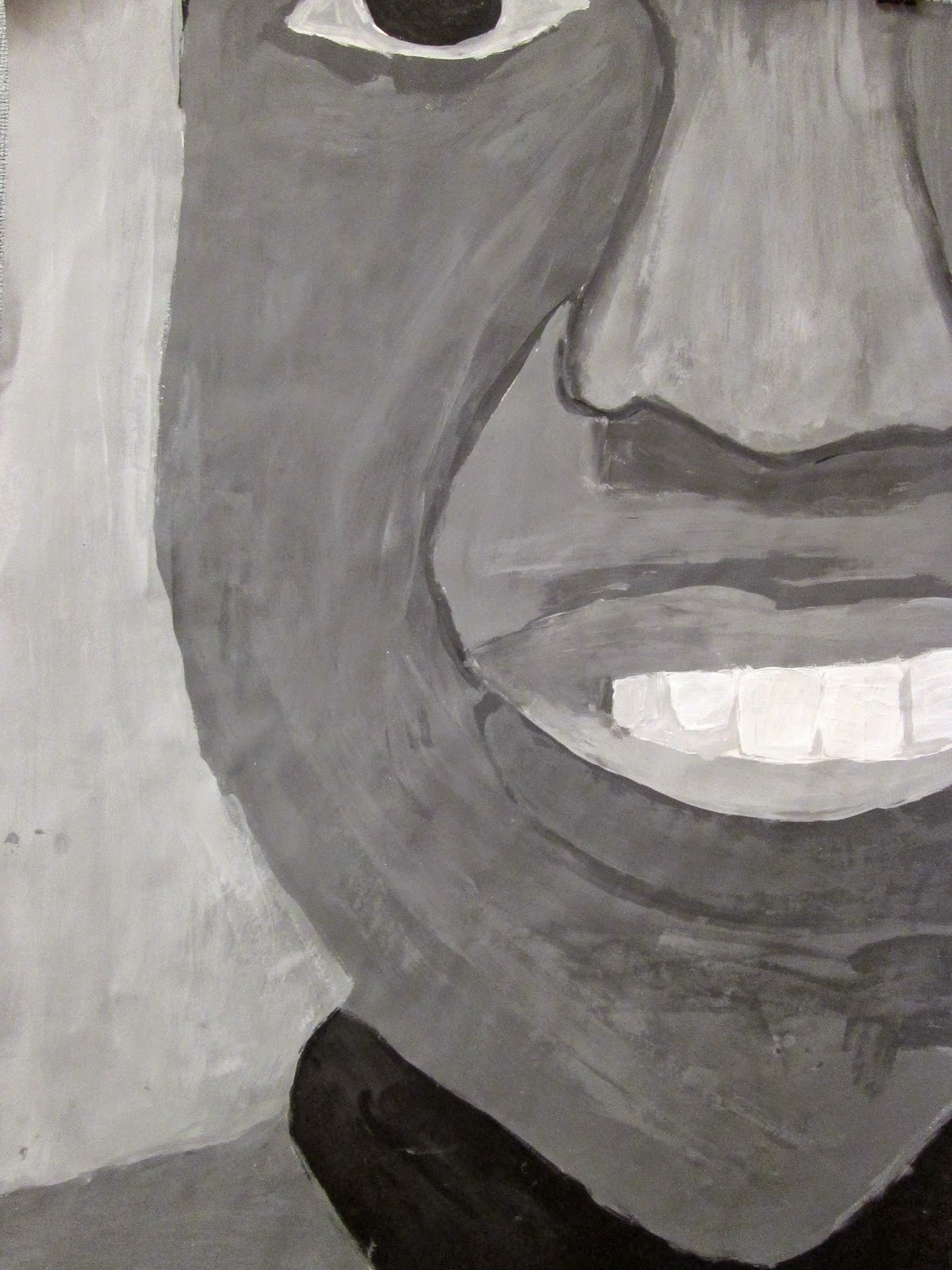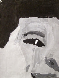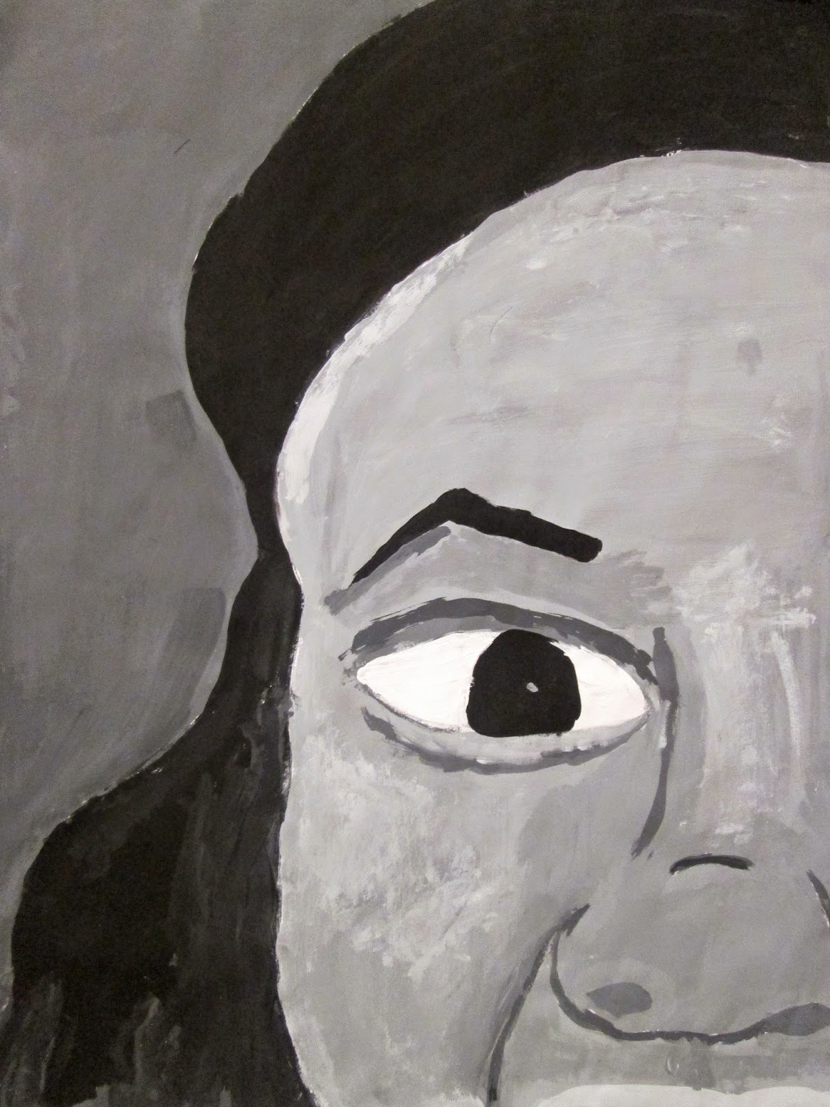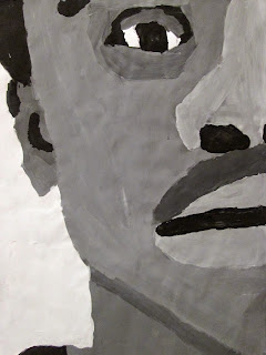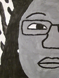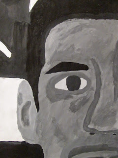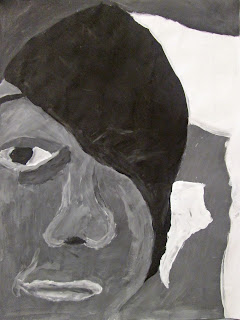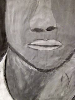 The 8th graders have been working very hard on these portraits for about two weeks. We first took photos of ourselves which we cropped in very tight on one segment of the face. Then we used a grid to enlarge the pictures to 18"X24". After that the students painted them in using a gray scale to mimic the look of our black and white photos. I am very proud of the work these students have done. The paintings turned out great. Check them out below.