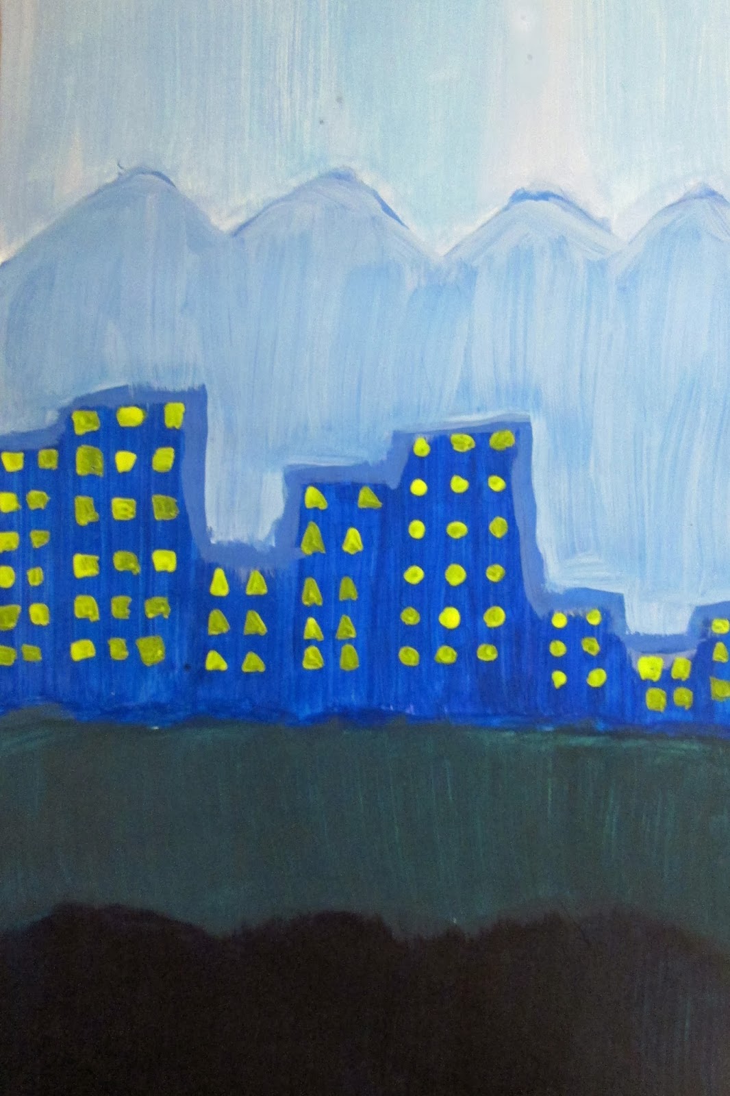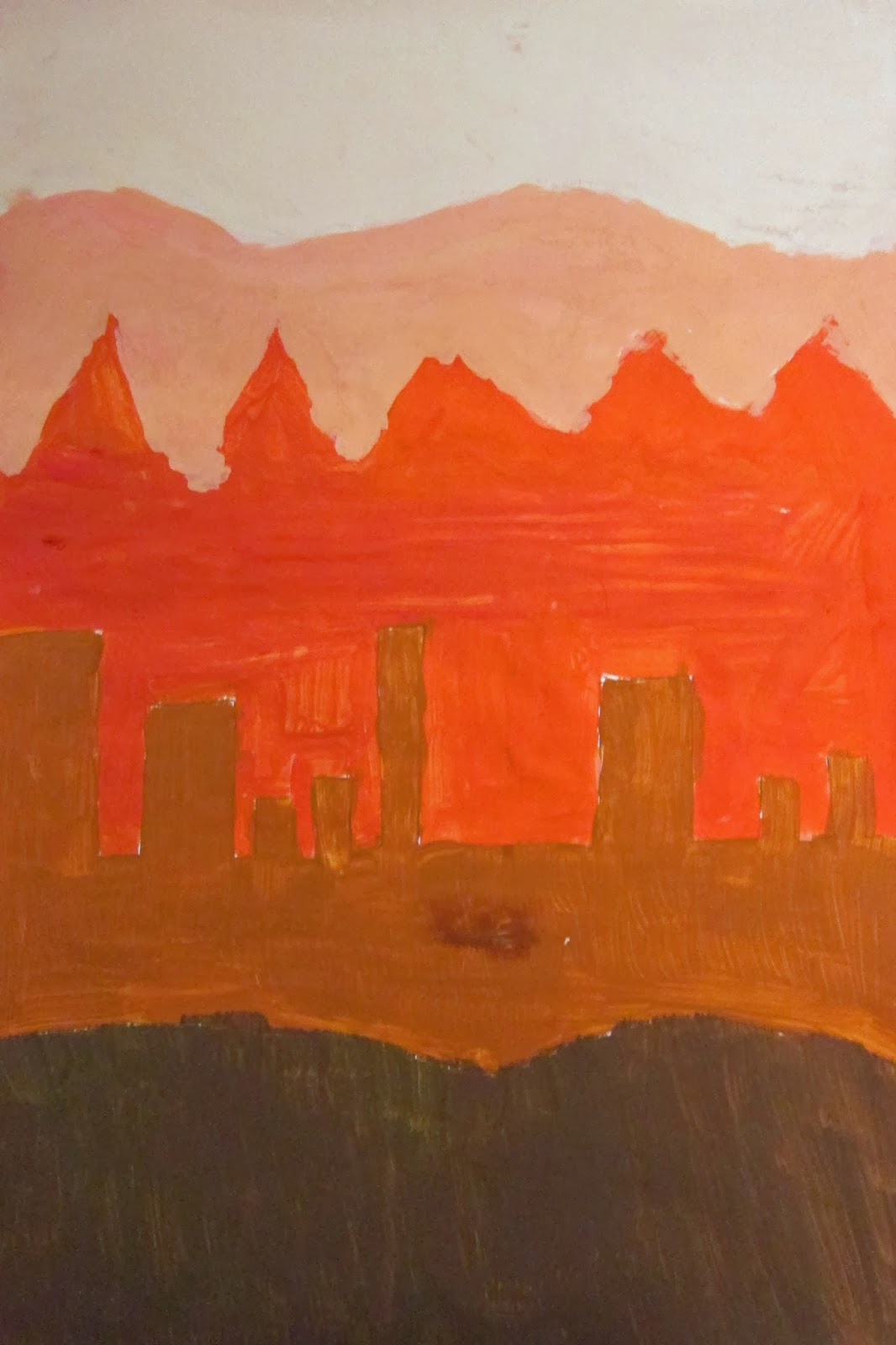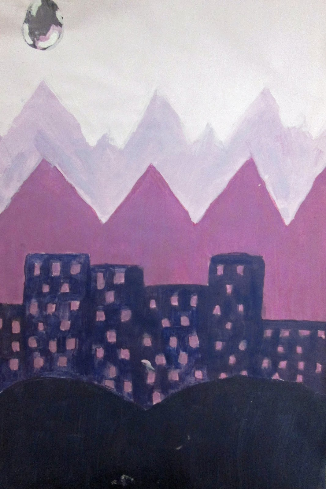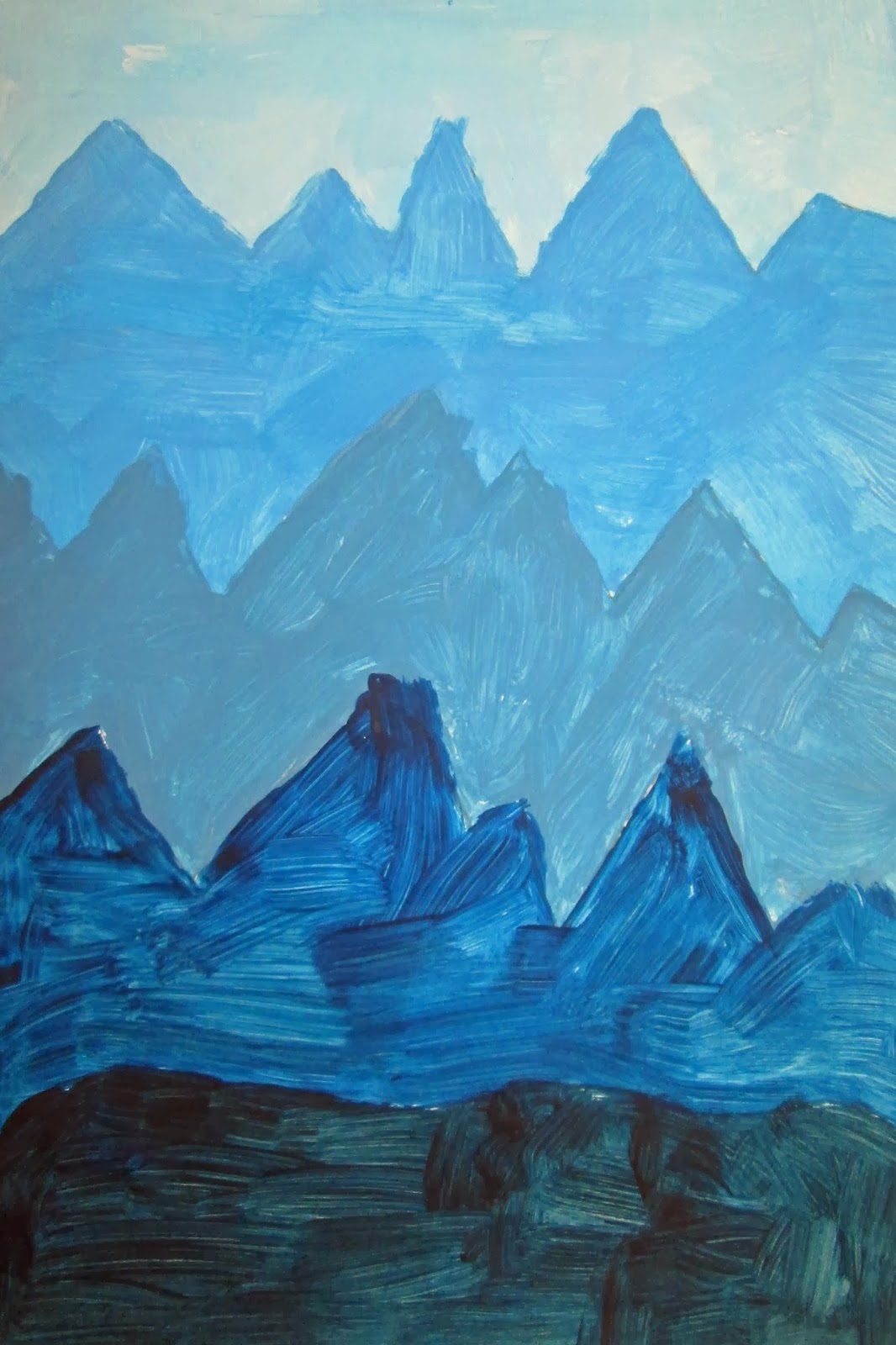 In 8th grade art we just finished a unit on value and to cap it off we created simplified landscapes that incorporated a 5 point value scale. Students drew simple layered landscapes and then painted them using 5 values (dark on the bottom------light on top). We discussed atmospheric perspective, and how colors on the horizon appear less saturated than those close to the viewer. Check them out:
