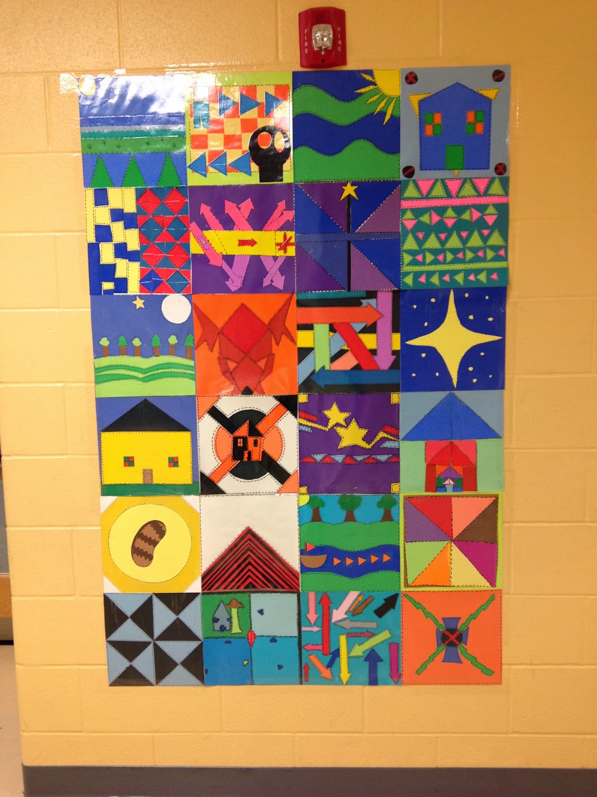 We recently finished our Underground Railroad secret message themed quilts in the 8th grade. After each student finished their square we put them together and hung the finished quilt in the hallway.